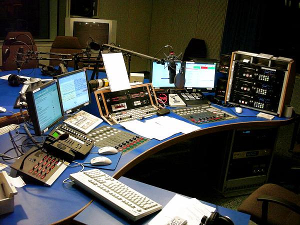 der "Selbstfahrer"-Arbeitsplatz der Radio-Moderatoren aus: